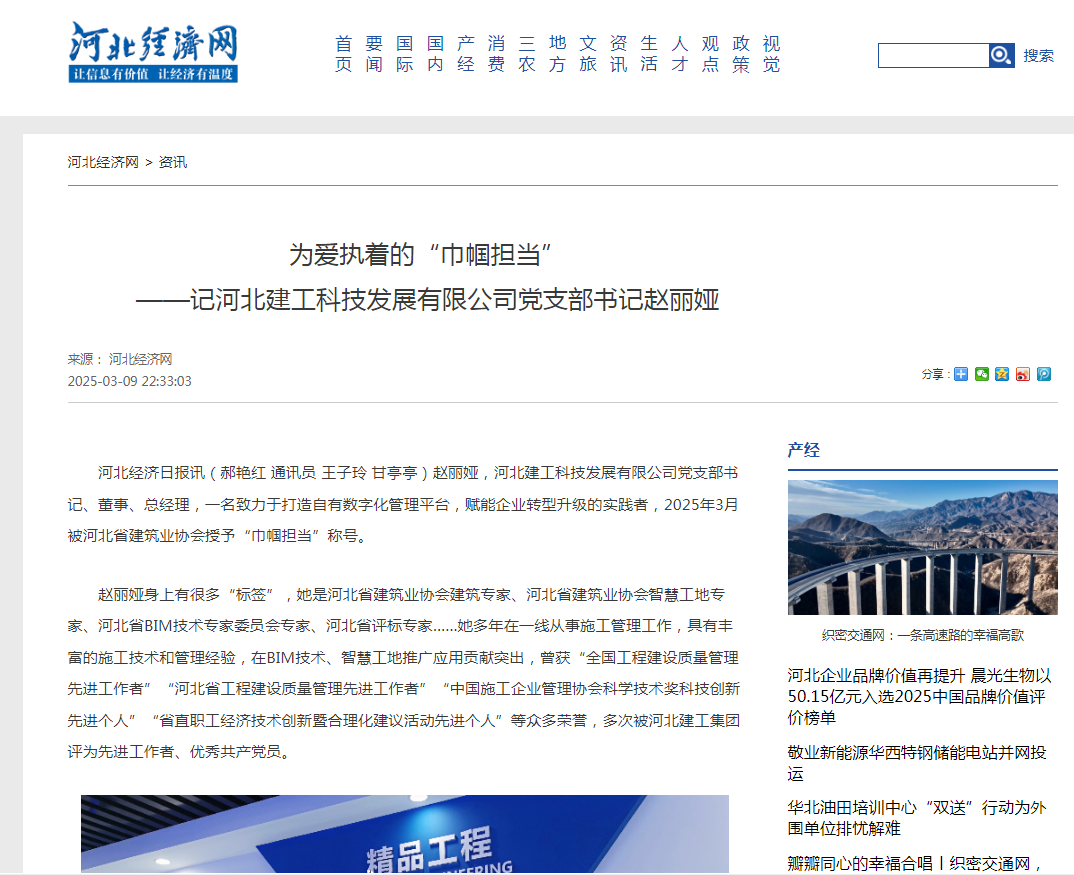 为爱执着的“巾帼担当” ??----记河北建工科技发展有限公司党支部书记赵丽娅 ? 赵丽娅,河北建工科技发展有限公司党支部书记、董事、总经理,一名致力于打造自有数字化管理平台,赋能企业转型升级的实践者,2025年3月被河北省建筑业协会授予...