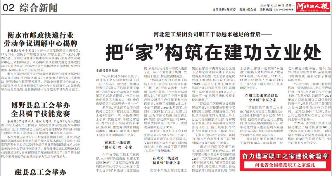 河北建工集团公司职工干劲越来越足的背后—— 把“家”构筑在建功立业处 “从中秋月饼到冬至饺子,项目部工会没有给我们落下过一样。”前不久,河北建工集团有限责任公司(以下称河北建工集团)宁晋产教融合基地项目部塔吊司机赵磊感慨道,“公司对待我们...