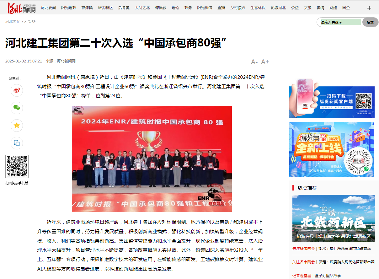 河北建工集团第二十次入选“中国承包商80强” ? ? 近日,由《建筑时报》和美国《工程新闻记录》(ENR)合作举办的2024ENR/建筑时报“中国承包商80强和工程设计企业60强”颁奖典礼在浙江省绍兴市举行。河北建工集团第二十次入选“中国...